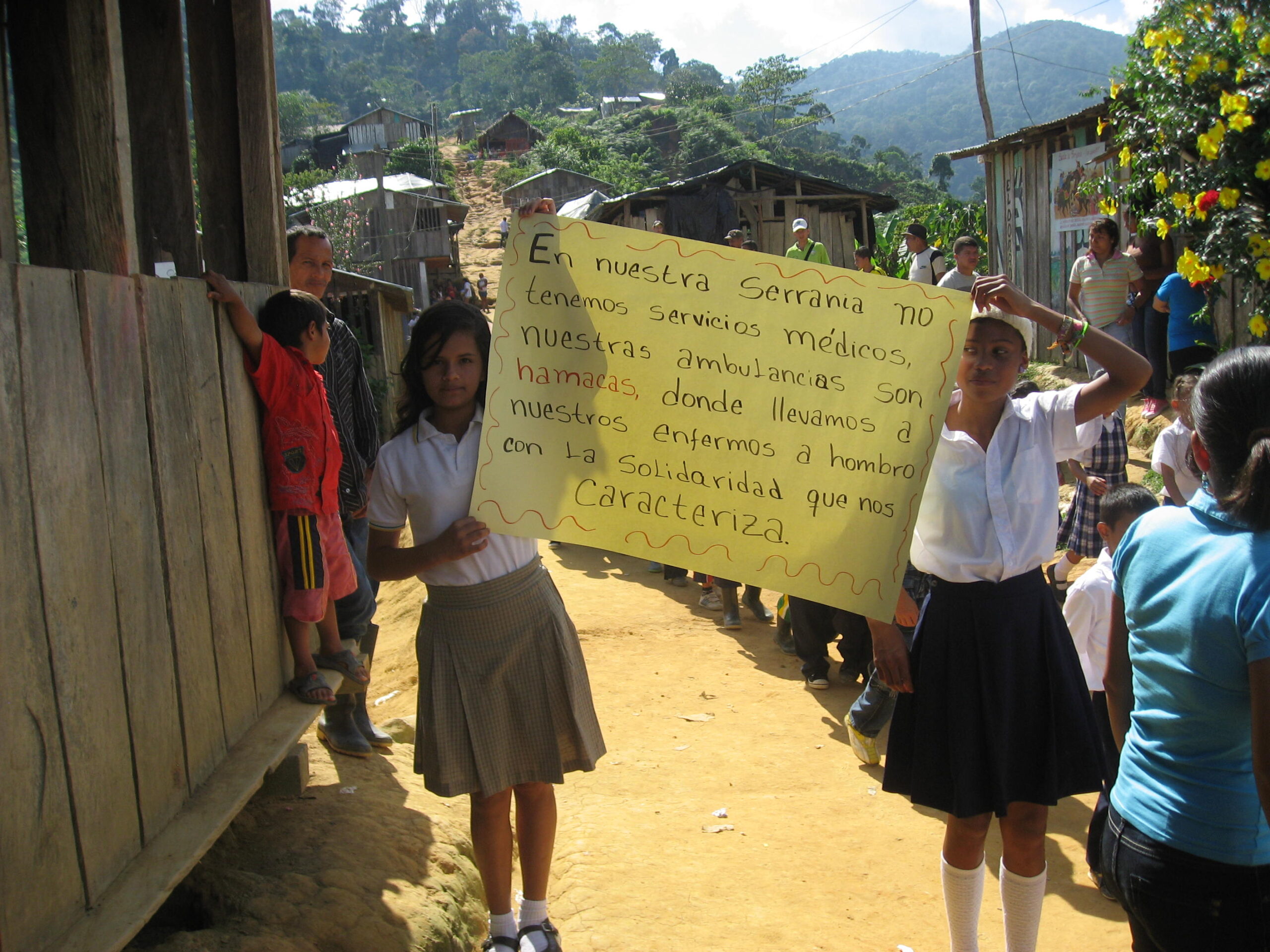 La pobreza es extrema, las enfermedades curables también. Pudimos ver recién nacidos con escamas en la piel sin que hubiera alternativa temprana, pues para ir a un hospital tienen que viajar hasta la ciudad de Cartagena, para lo cual necesitan dinero y conseguir diferentes medios de transporte. El calor acecha. No tienen ventilador, y si tuvieran no serviría de nada, pues la electricidad funciona de vez en cuando y en horarios reducidos. En el sur de Bolívar los centros de salud no tienen médicos y el transporte consiste en horas de trocha, canoa y transporte terrestre en carreteras hechas por ellos mismos que cuando llueve quedan imposibles de transitar. Ni hablar de acueducto. El Estado brilla por su ausencia, excepto por el Ejército que está por todo lado haciendo retenes.