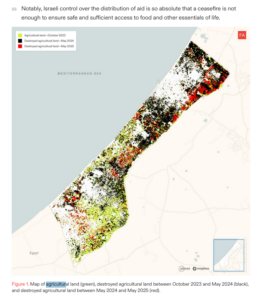 Según el centro de investigación Forensic Architecture (2024), entre el 7 de octubre de 2023 y el 30 de junio de 2024, Israel destruyó en Gaza aproximadamente el 80% de la vegetación, el 70% de las tierras de cultivo y huertas, más de 3.700 invernaderos (el 45% del total), más del 47% de los pozos de agua subterránea y el 65% de los depósitos de agua (se desconoce el estado del 29% de los pozos). Además, ninguna de las instalaciones de tratamiento de aguas residuales sigue en funcionamiento. El ejército israelí dirigió sus acciones militares hacia la contaminación y destrucción de los recursos naturales necesarios para garantizar la supervivencia del pueblo palestino, afectando de manera aguda la capacidad de producción alimentaria por parte del campesinado. Por ello, sabemos que Israel ha usado el hambre como un arma genocida: